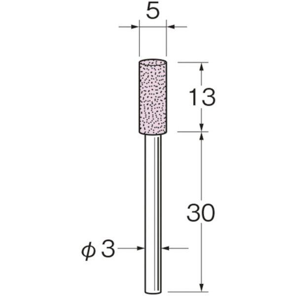 ・粒度(#):60・外径(mm):5・幅(mm):13・軸径(mm):3・軸長(mm):30・最高使用回転数(rpm):88000・砥粒:PAピンク・全長(mm):43・色:赤・結合剤:V・結合度N