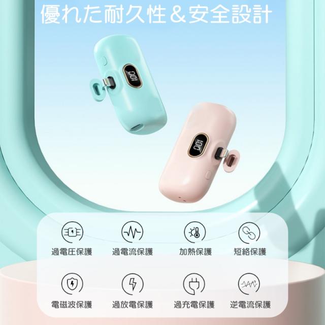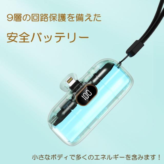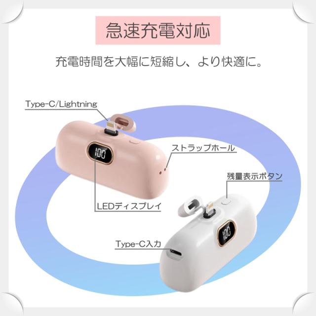 モバイルバッテリー 5000mAh T186 軽量 大容量 小型 iPhone Type C Lightning ライトニング ケーブル内蔵 LED残量表示 急速充電器 タイプ C 高品質 コンパクト PSE認証 コネクター内蔵 スマホ充電器 機内持ち込みOK 充電器 携帯充電器