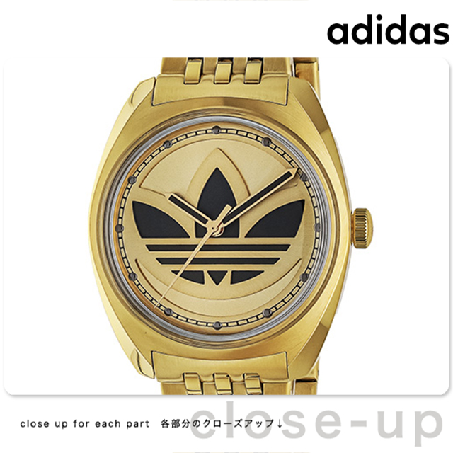 アディダス メンズ 腕時計 AOFH23509 adidas EDITION ONE アナログ ゴールド ◆スポーツ用品メーカーとしても知られる有名なブランドadidasより2001年、ストリートスポーツウエアブランド「adidas Originals (アディダス オリジナルス)」がスタート。1972年から1996年までadidas社のカンパニーロゴだったトレフォイルロゴ(三つ葉のロゴ)をシンボルマークとし、アスリートのために開発された復刻商品から、現在のトレンドを反映させた新作モデルやコラボレーション商品まで、幅広いアイテムを展開しています。 大胆なデザインのエレガントな腕時計、Edition One。中央に大きなトレフォイルロゴを配した文字盤が、ドーム型レンズを組み込んだスタイリッシュなステンレススチールのケースに収まっている。様々なシーンでお使いいただけ、プレゼントにもおすすめです。