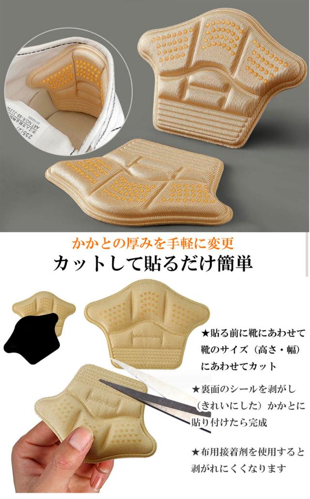 かかとクッションパッド 2組(4枚)セット スニーカー かかとパッド サイズ調整 パカパカ防止 靴ずれ 滑り止め ヒール 衝撃吸収 ハサミ カット シール 粘着 パッド かかと クッション 保護 厚手