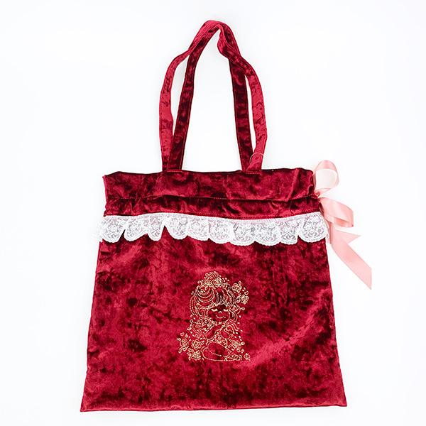 水森亜土 レース&ベロア 巾着トートバッグ (ワインレッド)