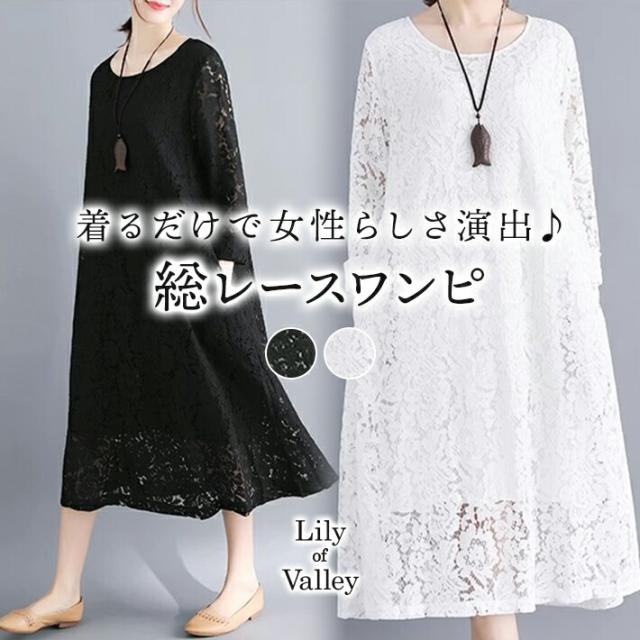 【新商品P10%】 総レース 長袖 フレアワンピース ミモレ丈 ラウンドネック 上品 きれいめ お呼ばれ 清楚 / レディース ふんわり 大きいサイズ カジュアル シアー ロング丈 ミモレ ロング オフィス 韓国 膝下 フォーマル レース 黒 白 ベージュ ブラック 秋冬 春
