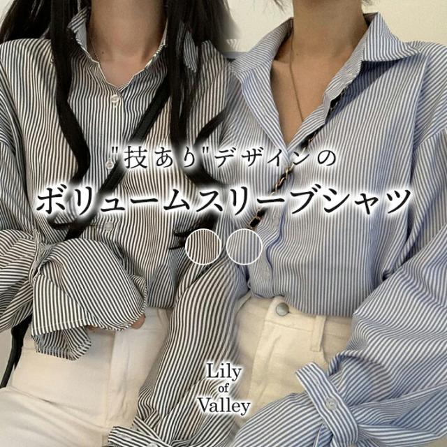 【新商品P10%】 ボリュームスリーブ ストライプ シャツ トップス 長袖 ゆったり カジュアル 清楚 上品 / レディース フリル ボリューム袖 袖コンシャス ブラウス きれいめ ふんわり オフィスカジュアル 韓国 大きいサイズ バルーンスリーブ 黒 青 ブルー ブラック 秋冬 春