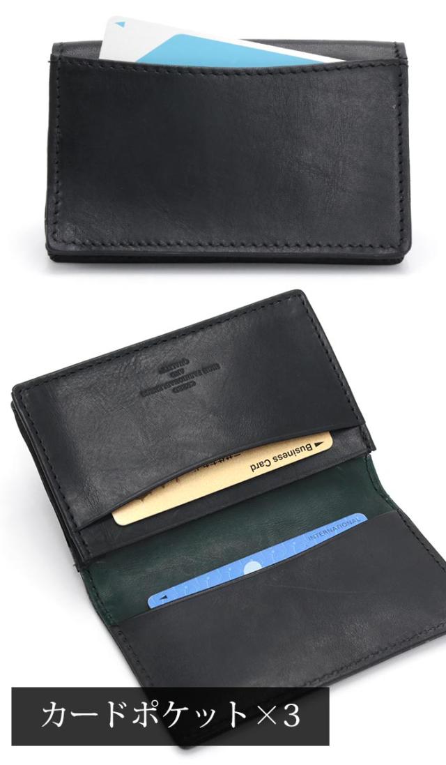 ジャケットなどのポケットにも収まるコンパクトなサイズ感。マチ付きのメイン収納に加え、カードポケットが3つ、名刺入れとしてだけでなく、カードケース、パスケースとしても使えるアイテムです。