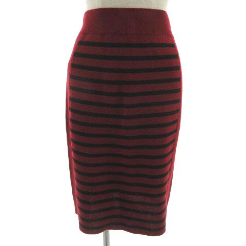 【中古】プリングル Pringle 1815 スカート ニット タイト ミディ丈 ウエストゴム ウール ボーダー 赤系 濃紺 UK10