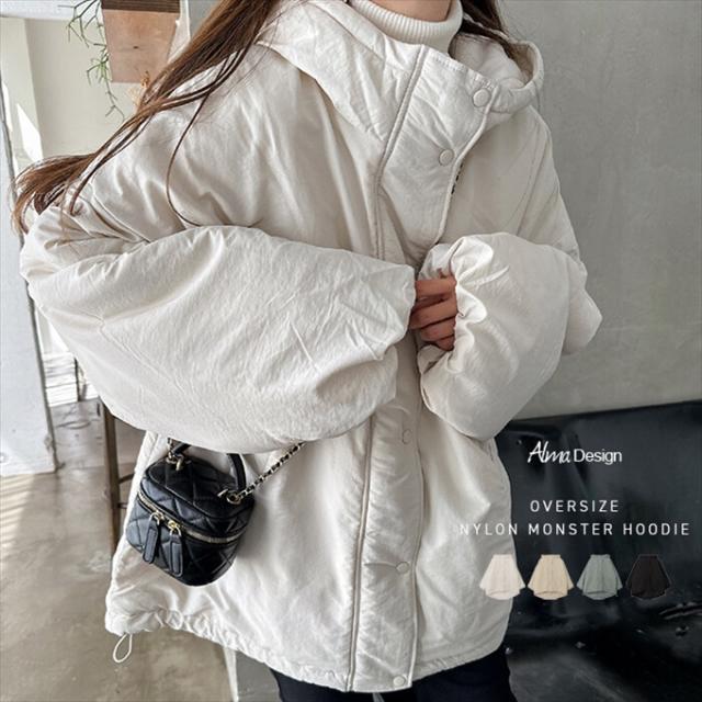 インパクトのあるオーバーサイズがトレンド感たっぷりなモンスターパーカーが入荷しました♪ナイロン特有の、表面にシワ感のあるシャカシャカとした質感が旬のアウター。中綿入りでとってもあたたかく、ビッグシルエットなのに軽い着心が魅力!内側の波型キルティング裏地は、暖かく、チラッと見えた時のニュアンスも可愛い♪フード付き。(取り外し不可の一体型タイプ)袖口はゴム仕様でしっかり防寒!袖周りもしっかりと幅があるので、厚手のニットの上から羽織ってもゆとりがあり、インナーを選ばないサイズ感です。ロゴTや柄トップスでアクセントを付ける着こなしも◎冬に大活躍間違いなしのイチ押しアウターです!