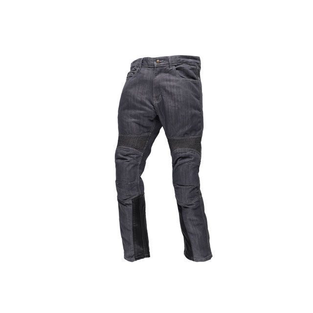 13オンスのデニムはしっかりとした厚みがありつつ、軽さも感じる生地です。更に腰から太ももの外側にかけて、ケブラーニットを使い転倒時に破れづらい仕様になっています。ライディング中に特に動きが必要な膝上、腰にシャーリング加工がしてあります。膝と腰にソフトなプロテクターが装備されております。膝下内側には本革を使い、ヒートガードの効果があります。