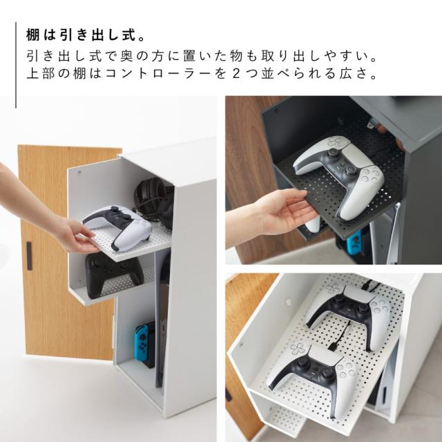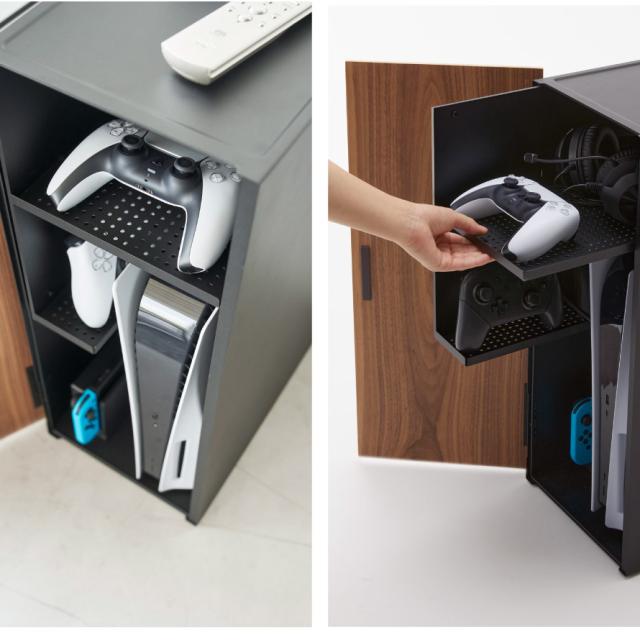 棚は引き出し式になっていて奥の方に置いた物も取り出しやすい。上部の棚はコントローラーを2つ並べても余裕のある広さです。