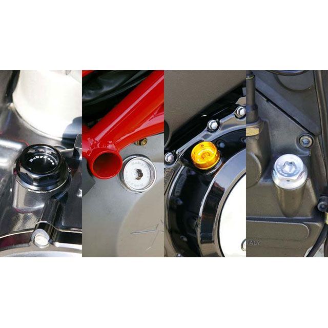 ラウンドタイプはキャップの中央には、6角レンチが使用できるホールを設けています(一部製品を除きます)。このホールはレンチが面接触するように、花びらデザインにしました。ワイヤーロックが出来るように、ワイヤーホールも開けてあります。車両又はエンジン側へは ワイヤーロックアンカーの使用をお勧めします。製品カラーは、ブラック、シルバー、ゴールドの各色から選択していただけます。