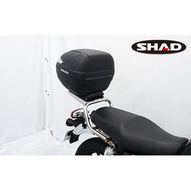 SHAD(シャッド) 製リアボックス【SH29】(サイズ:380mm(L) x 400mm(W) x 300mm(H)・本体重量:約2.6kg・容量:29L)を装備したタンデムバーです。