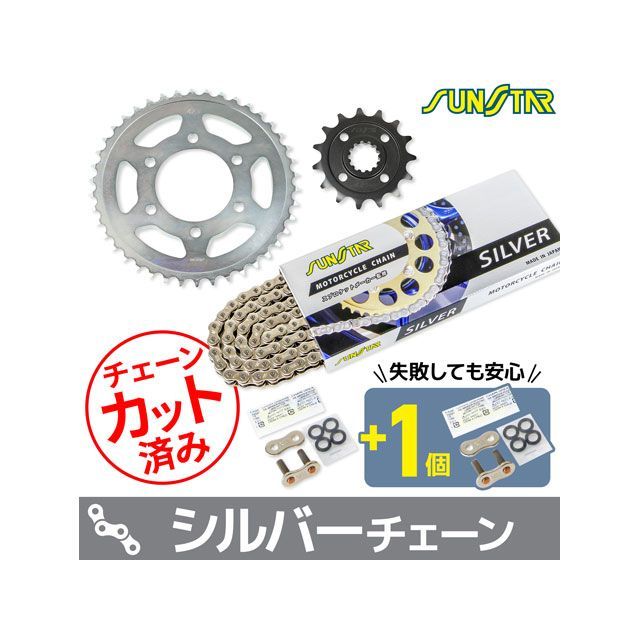 サンスターのチェーン、サンスターの前後スプロケットで構成されているので安心してお使い頂けます。