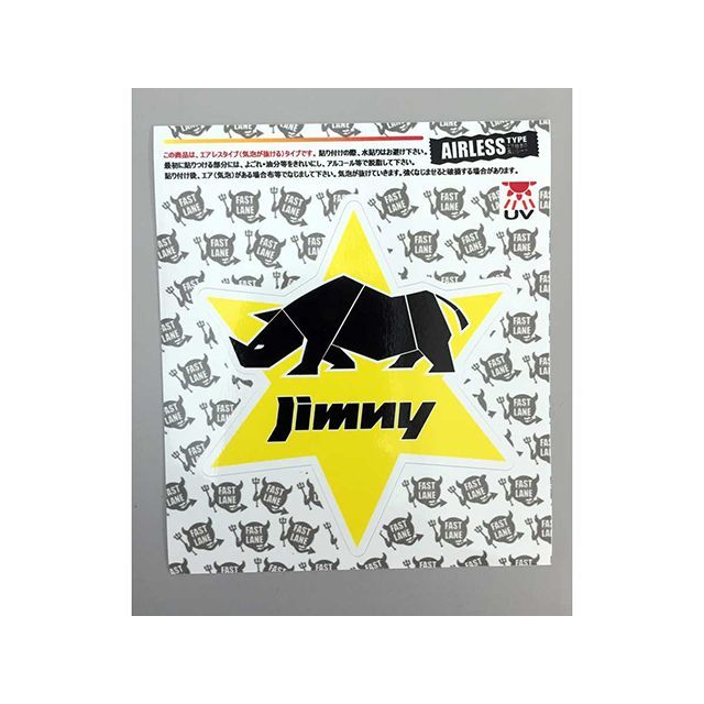 初代ジムニーの煽りドアシールをモチーフにした、星型SUZUKI JIMNY サイのイエローステッカーです。シールサイズ縦120mmX横106mm