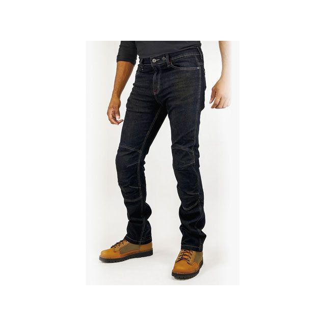 普段着同様に履くだけで手軽にプロテクターを装着できるレギュラーフィットストレッチジーンズ。両膝にCE規格レベル2プロテクターを標準装備。プロテクターを着脱しやすい外入れ式を採用。また、別売りハードプロテクターに換装も可能。裾裏のリフレクターはロールアップすることで使用可能。