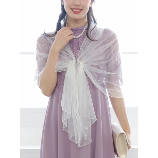 ビジューやパール調が散りばめられた煌びやかな風合い漂うショール。