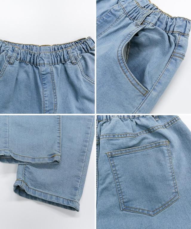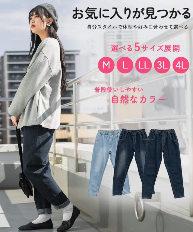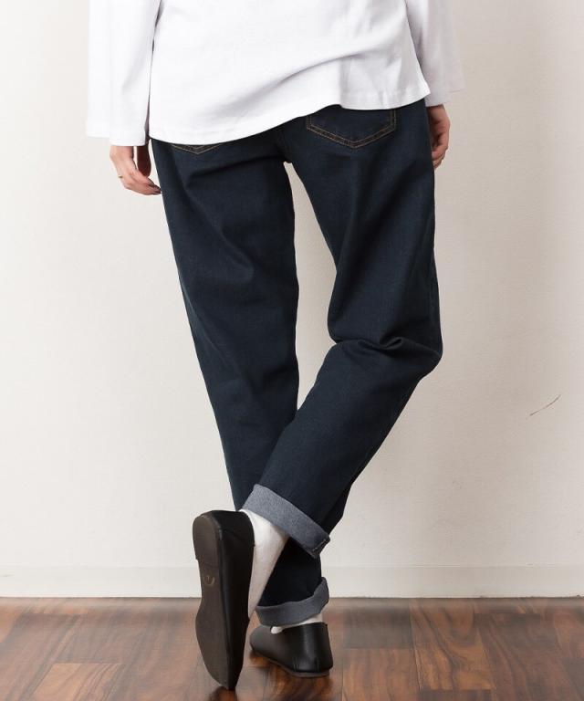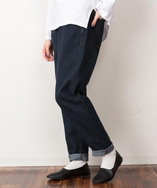 ウエストゴムテーパードデニムパンツ。