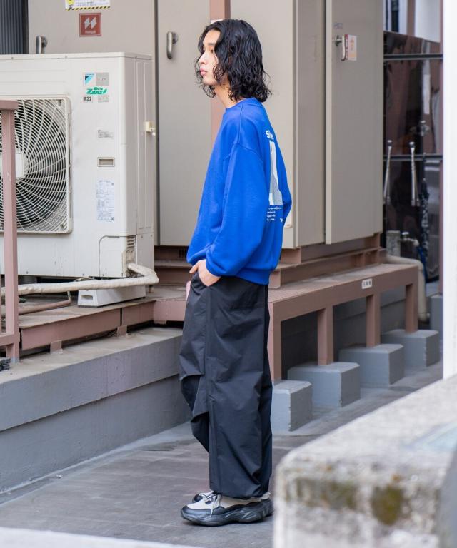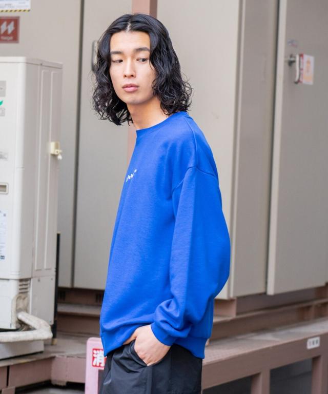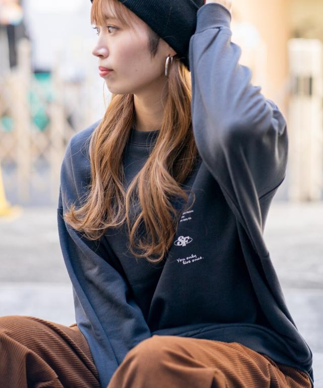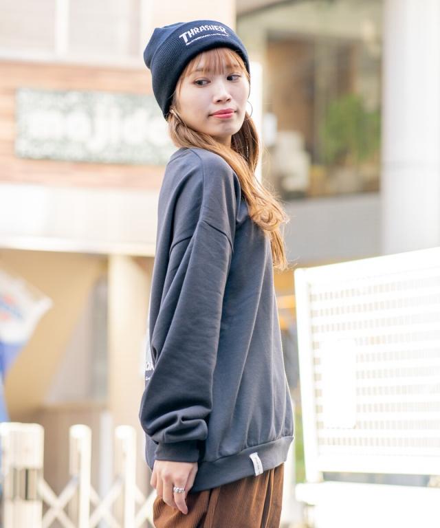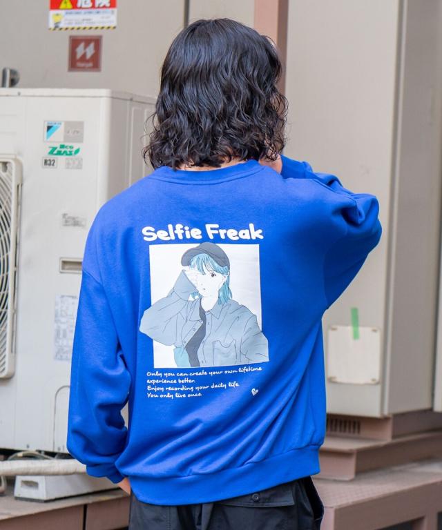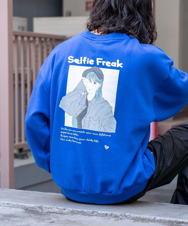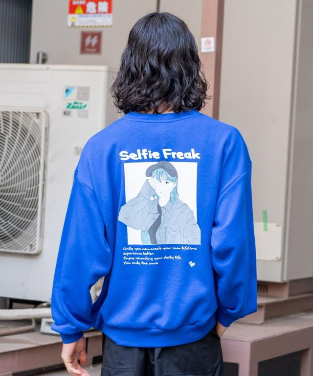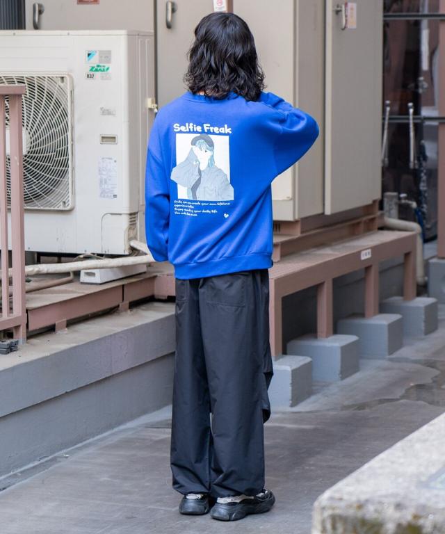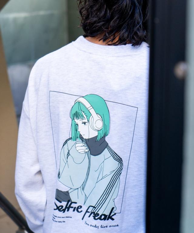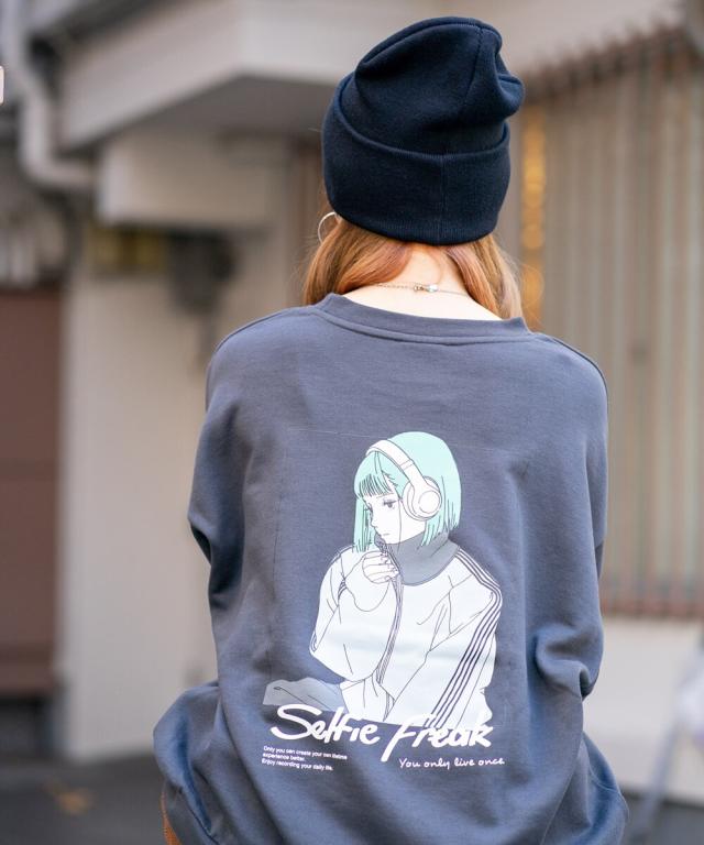 バックにイマドキな女の子のプリントが入ったビッグシルエットの裏毛トレーナー。アンニュイな表情がエモい雰囲気を醸し出すイマドキな女の子は、今っぽさと90年代の空気が交錯したオリジナリティ溢れる雰囲気に仕上がっています。
