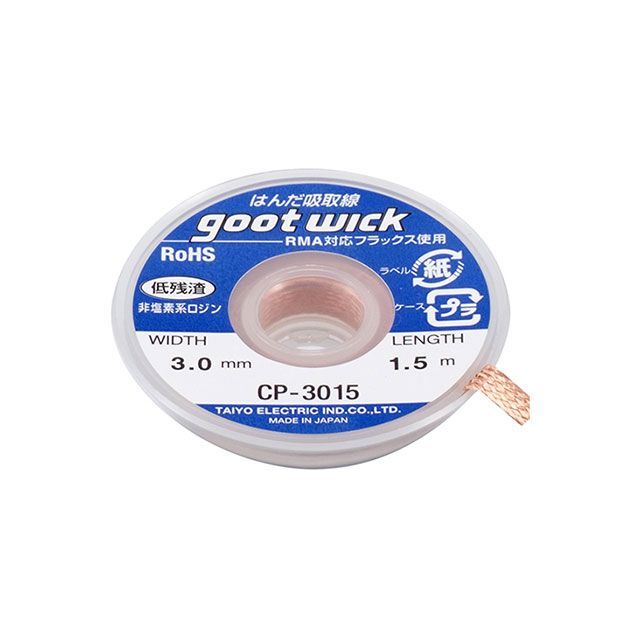 プリント基板のはんだを除去するときに使用します。残渣の少ない無洗浄(RMA)タイプのフラックスを使用しています。RoHS対応品です。鉛フリーはんだ対応です。線幅3.0mmはんだ吸取線です。