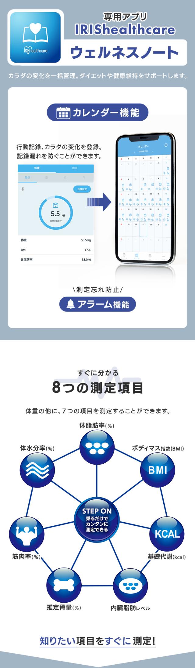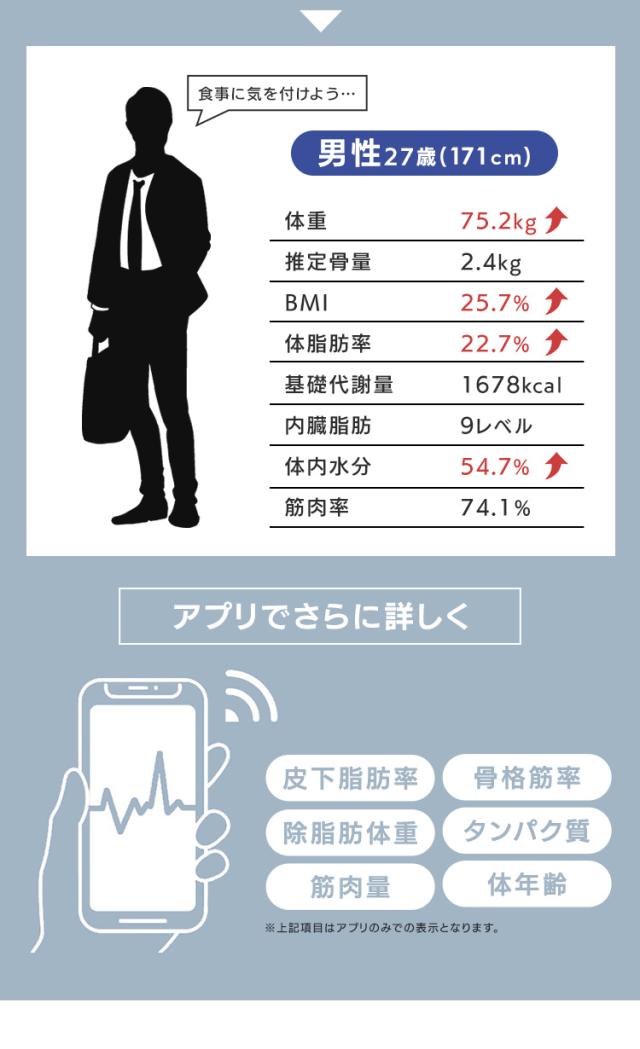 体重、体脂肪率、体水分率、筋肉率、推定骨量、内臓脂肪レベル、基礎代謝、BMI