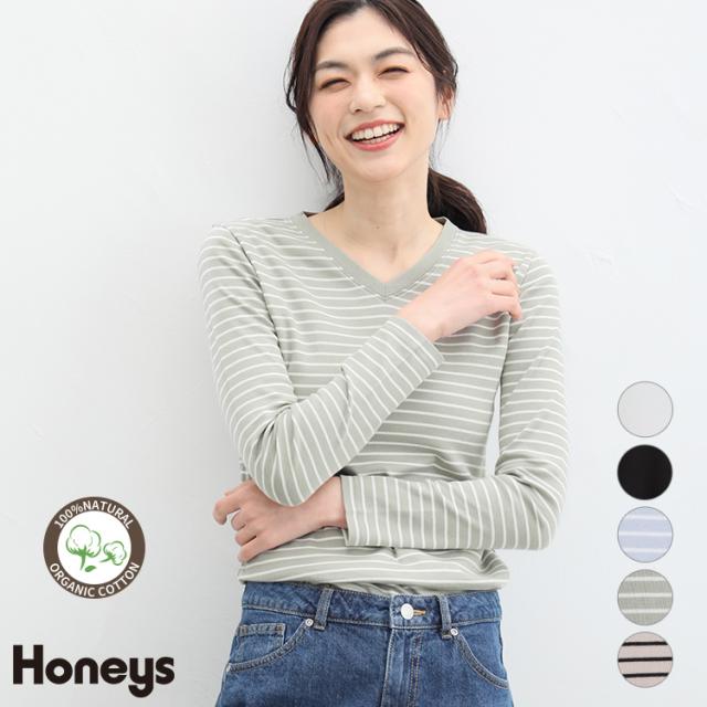 トップス 長袖 Vネック 綿100% レディース シンプル ボーダー 無地 インナー Tシャツ ロンT Honeys ハニーズ オーガニックVネックT