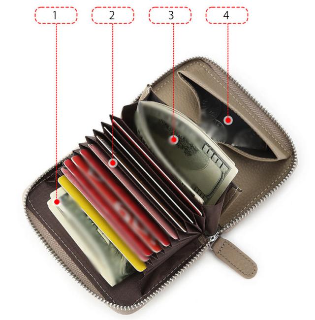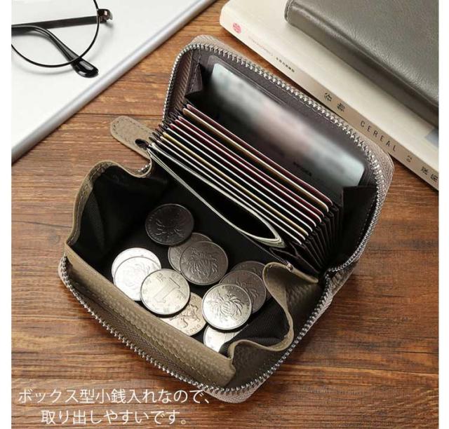 | 1、スキミング防止機能があるので、海外旅行や満員電車で個人情報を盗み取られる心配はありません。 2、厳選された良質な牛革を使用。シボ加工で触り心地がとても良い。耐久性にも優れています。 3、ボックス型小銭入れなので、取り出しやすいです。 4、ジャバラ式で180°まで開けるので、カードを探しやすいです。 5、おしゃれな外ポケット付き。 | |