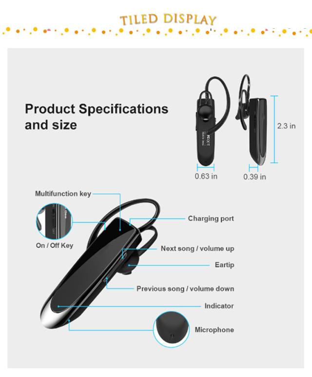 | サイズについての説明 | サイズ:5.8*2.4*1.6cm 音楽再生時間:24時間 バッテリー容量:250mAh 通信距離:15m 待機時間:1440時間抹掉英文 |