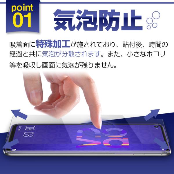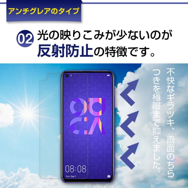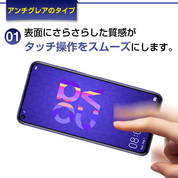 HUAWEI nova 5T用液晶保護フィルムです!高光沢とアンチグレアの2タイプからご選択いただけます!吸着面に特殊加工が施されており、貼付後、時間の経過と共に気泡が分散されます。また、小さなホコリ等を吸収し画面に気泡が残りません。 表面に防指紋加工を施すことで指紋が目立ちにくくなりベタつきによる操作性・視認性の低下を軽減します。高光沢のタイプは指触りがツルツルとなめらかでスマホの操作を邪魔する事なく、その透明度は付けている事を忘れてしまう程です。指紋付着を抑えながら、写真や動画を鮮やかに表現できます。アンチグレアのタイプは表面にさらさらした質感がタッチ操作をスムーズにします。光の映りこみが少ないのが反射防止の特徴です。反射を抑え、指紋による汚れを防ぎます。不快なギラツキ、画面のちらつきを極限まで抑えました。
