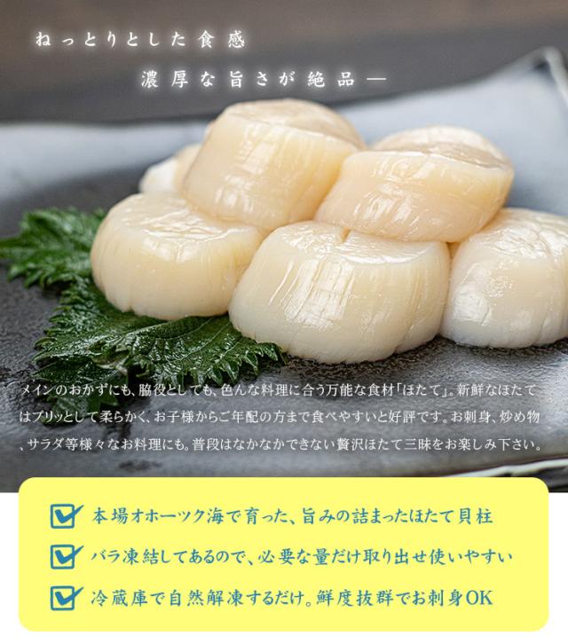 北海道で水揚げされた生ホタテをたっぷりお届け!貝柱は肉厚でねっとりとした食感、甘くコクのある濃厚な旨みが絶品。お刺身、フライ、バター焼きなど色々なレシピでお召し上がり下さい。バラ凍結で小分けもOK!必要な分だけ解凍して料理に使えます。