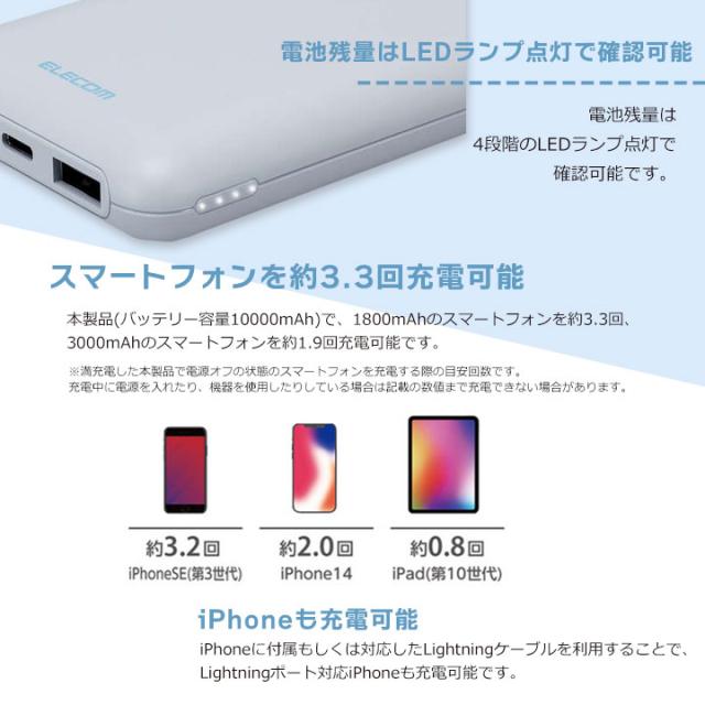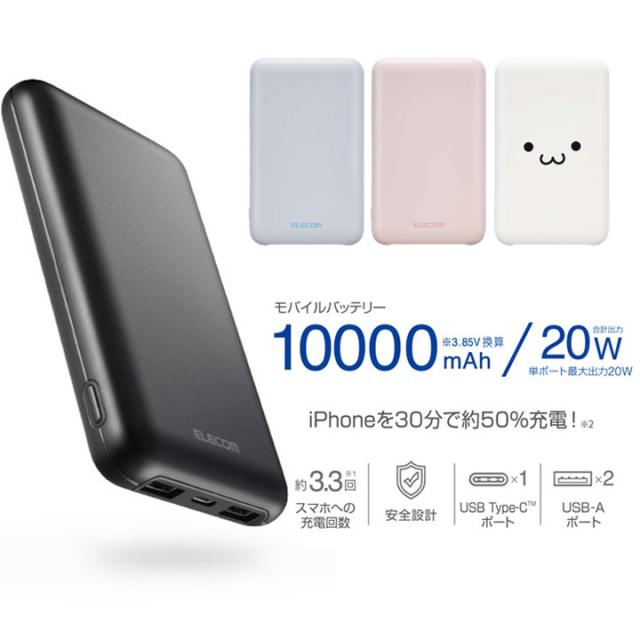 薄型コンパクトモバイルバッテリー 10000mA 20W Type-C×1 USB-A×2 USB PowerDeliveryド ホワイトフェイス ホワイト メール便送料無料