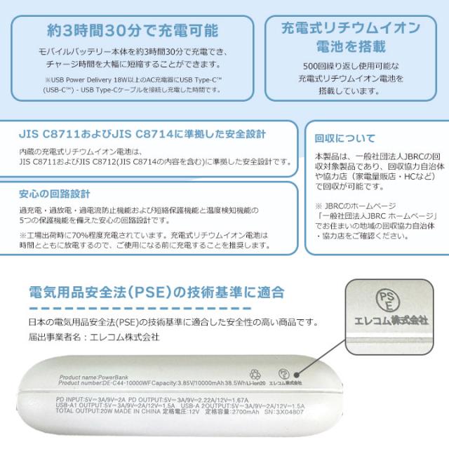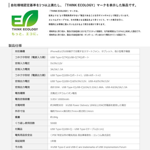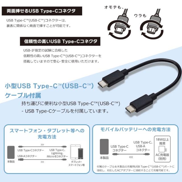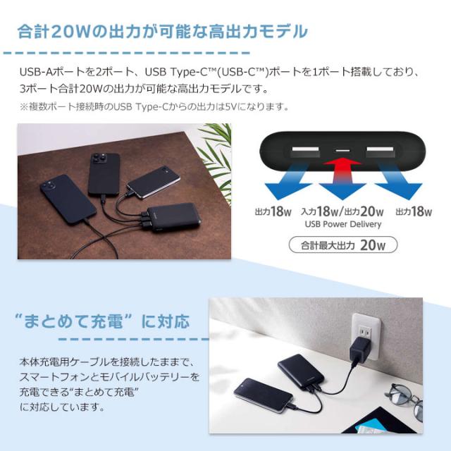 USB Power Delivery規格に準拠し合計出力20Wの10000mAhモバイルバッテリーです。