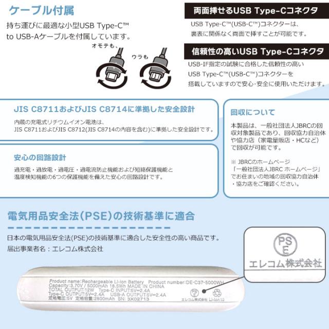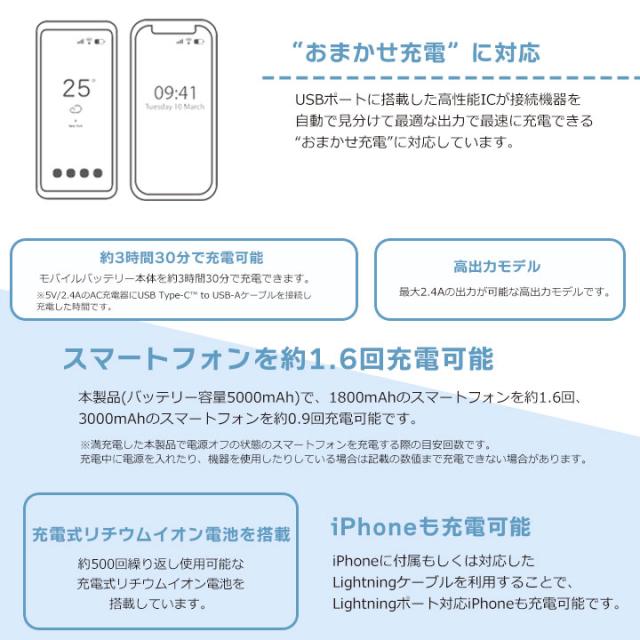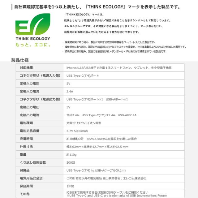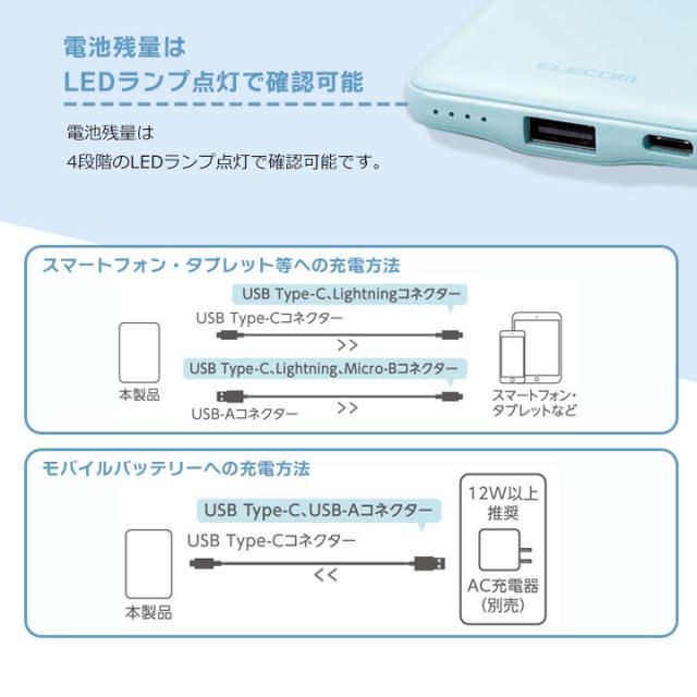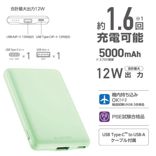 薄型コンパクトモバイルバッテリー 5000mAh 2.4A Type-C×1 USB-A×1 USB ブルー ダークグレー グリーン ピンク ホワイトフェイス ホワイト メール便送料無料