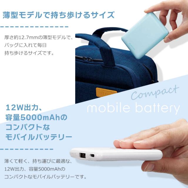 薄くて軽い、持ち運びに最適!12W出力、容量5000mAhのコンパクトなモバイルバッテリーです。