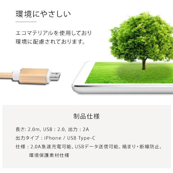 仕様 : 2.0A急速充電可能、USBデータ送信可能、絡まり・断線防止、環境保護