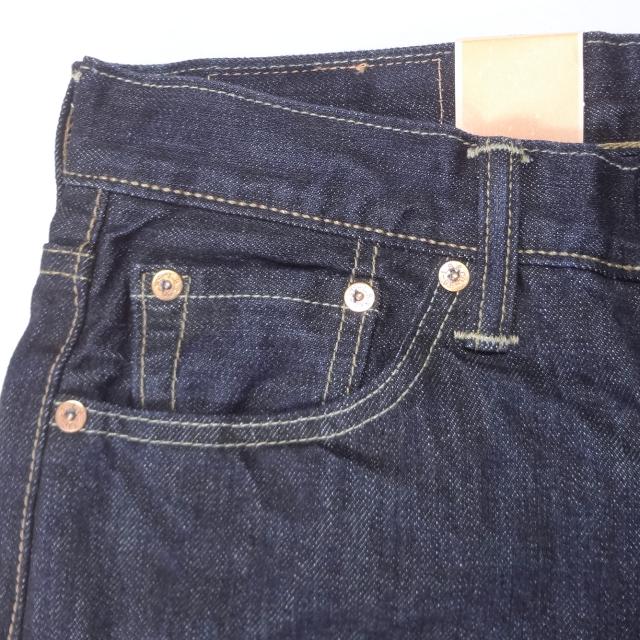 ・スモールeレッドタブ、ボタンフライ、V字ステッチ補強、レザーパッチ、5ポケットリベット、アーキュエットステッチ