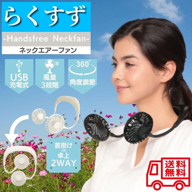 【送料無料】ネックエアーファン らくすず 扇風機 USB充電式 風量3段階調節 首掛けor卓上2WAY ネックファン