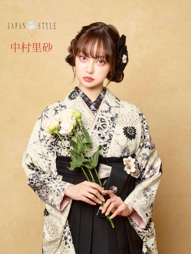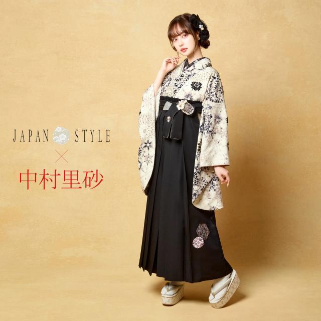 中村里砂×JAPAN STYLE 二尺袖 着物 袴 レンタル フルセット和服 袴 モダン レトロ はかま【貸衣装 卒業式 大学生】【袴 Mサイズ】刺繍 個性派 フェミニン ベージュ 白 黒 ブラック 花柄【JN34】