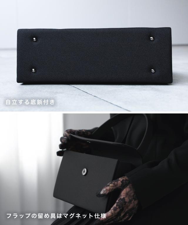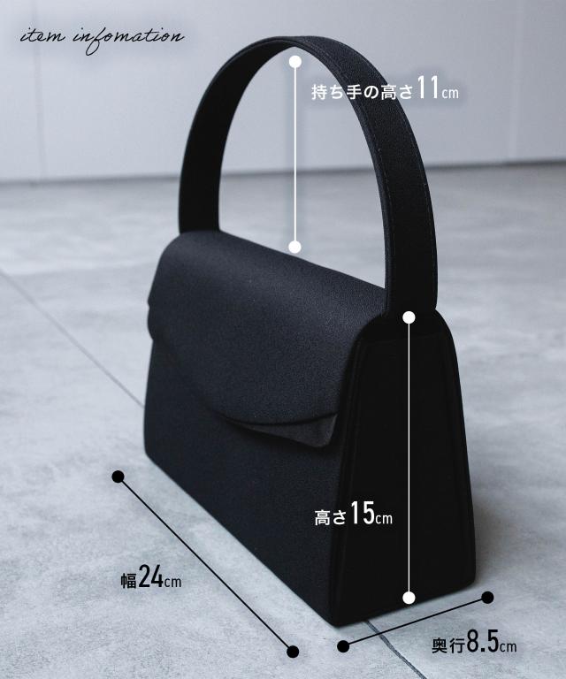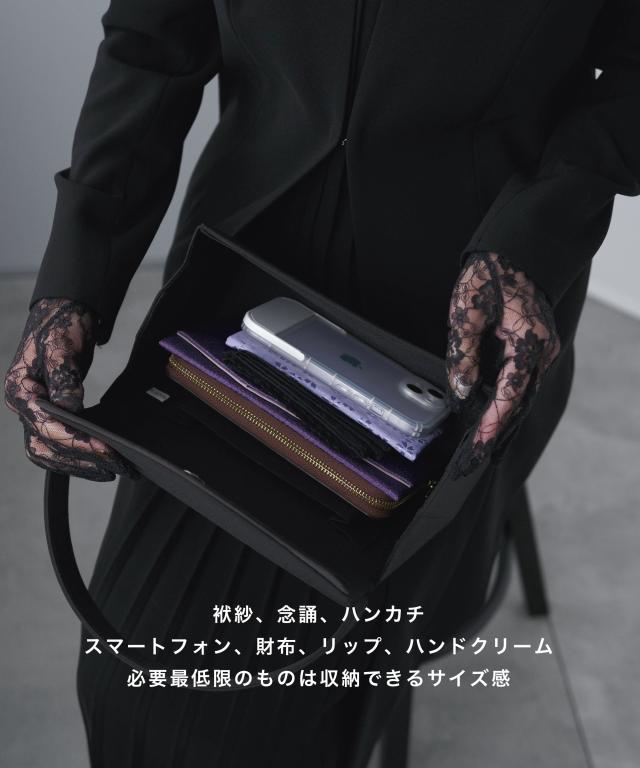 上品でシンプルなデザインのフォーマルバッグ。 年代問わず長年お使い頂けるベーシックなデザイン。 袱紗、念誦、ハンカチ、スマートフォン、財布、リップ、ハンドクリーム、 必要最低限のものを収納できるサイズ。 開口部は開閉のしやすいマグネット仕様。 側面がアコーディオン仕様になっているため、開口部が大きく開くので中のものが見やすく、また出し入れしやすいのも魅力です。 底部は底板と底鋲付きなので、たっぷり荷物を入れても型崩れしづらく、底部が汚れにくくなっております。 持ち手の高さ:11cm (外寸)幅:24cm / 奥行:8.5cm / 高さ:15cm (内寸)幅:23.5cm / 奥行:7.5cm / 開口 :14cm |