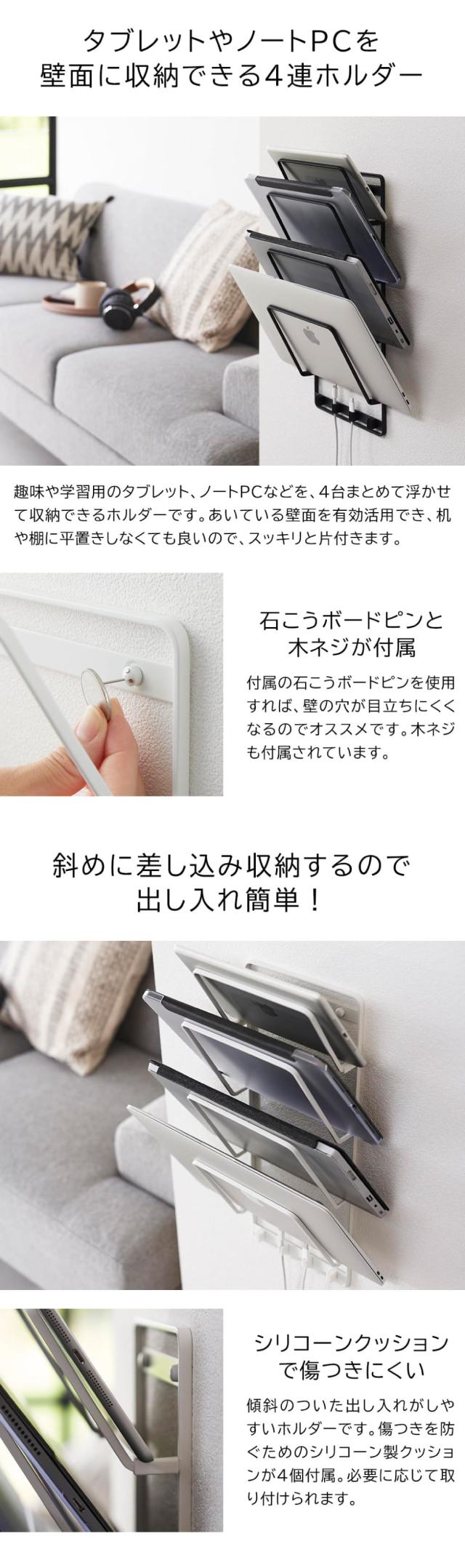 置き場所に困るノートPCや学習用タブレットを壁面に4台まとめて収納できるホルダーです。壁の穴が目立ちにくい石こうボードピンでお好みの位置に設置可能。斜めに収納するので出し入れがスムーズです。学習机まわりに設置して、お子様の本や学習用タブレットの定位置としてもおすすめ。付属の木ネジでも設置できます。