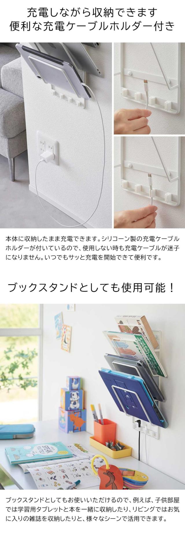 タブレットやノートPCを4台壁面収納できるホルダー。石こうボードピンと木ネジ付属。充電しながら収納可能。便利な充電ケーブル用ホルダー付き。リビング 浮かせる収納