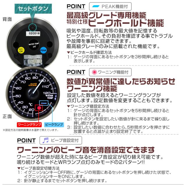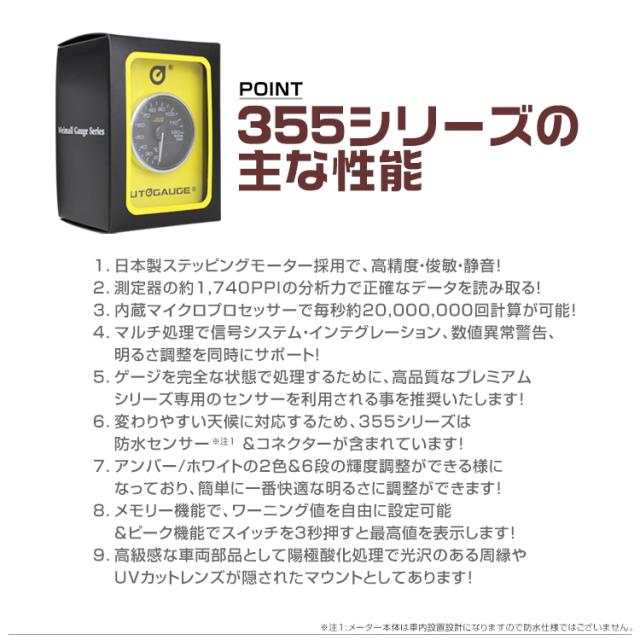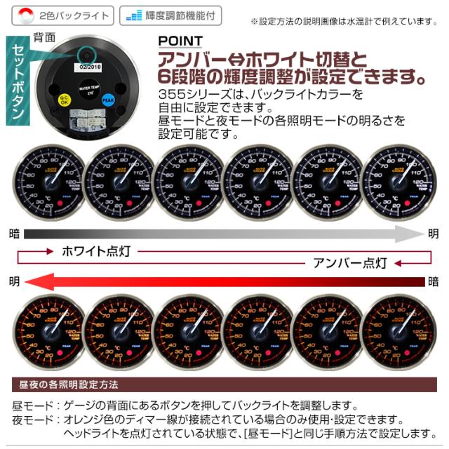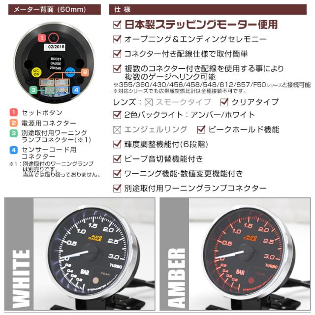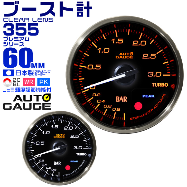 ブースト計 60mm 60Φ プレミアムシリーズ オートゲージ 2色バックライト 車 メーター 追加メーター 後付け Autogauge 日本製モーター ワーニング機能 ピークホールド機能 ディスプレイ 355シリーズ 送料無料