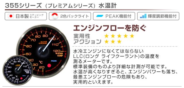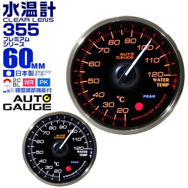 水温計 60mm 60Φ プレミアムシリーズ オートゲージ 2色バックライト 車 メーター 追加メーター 後付け Autogauge 日本製モーター ワーニング機能 ピークホールド機能 ディスプレイ 355シリーズ 送料無料