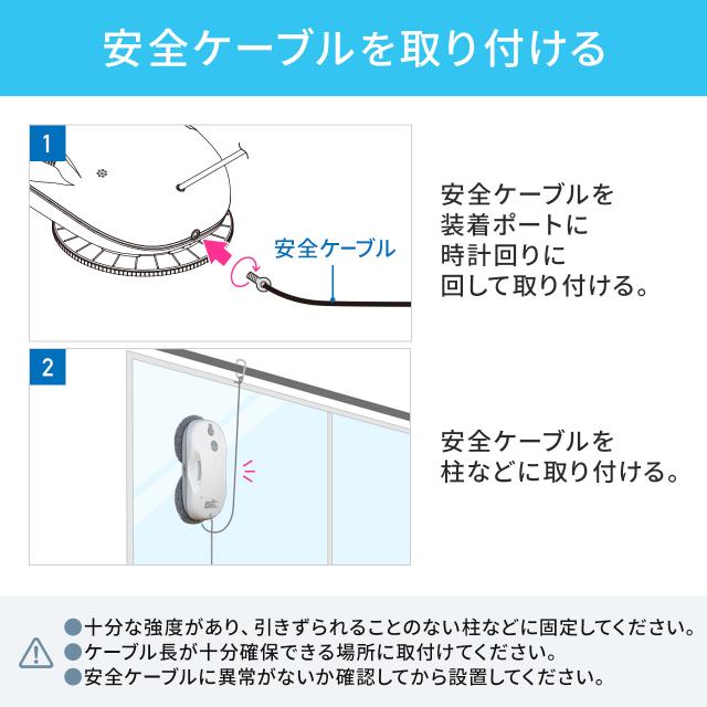 ●落下防止用ロープが付属しており、先端のカラビナフックをカーテンレールなどにつないでおくことで、本体の落下を防止します。