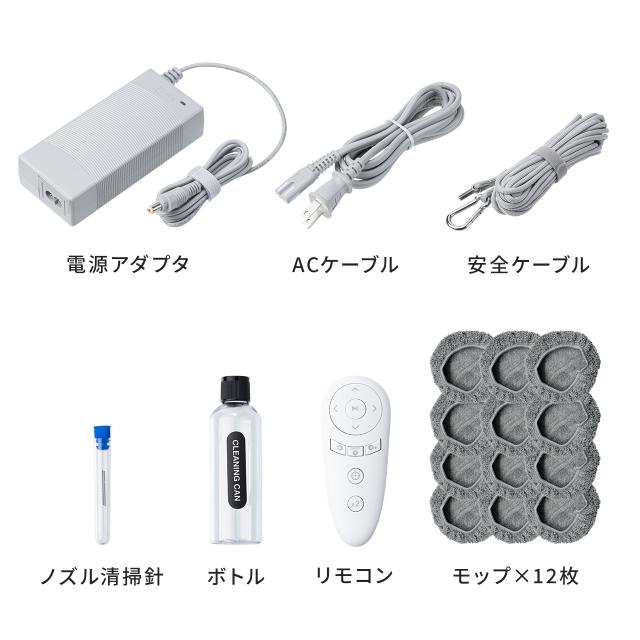 ■セット内容:本体、リモコン、モップ×12、安全ケーブル、電源アダプタ、ACケーブル、ボトル、ノズル掃除計