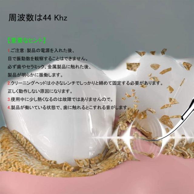 【重要なヒント】1.電源を入れた後、歯茎や柔らかい物に接触した時に超音波振動が発生しません。クリーニングヘッドは、歯や鉄製品などの非常に硬い物体に接触した場合のみに大きく振動し、耳障りな音が発生します。2.クリーニングヘッドは小さなレンチでしっかりと締めて固定する必要があります。正しく動作しない原因になります。
