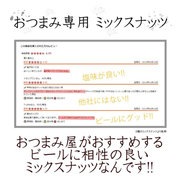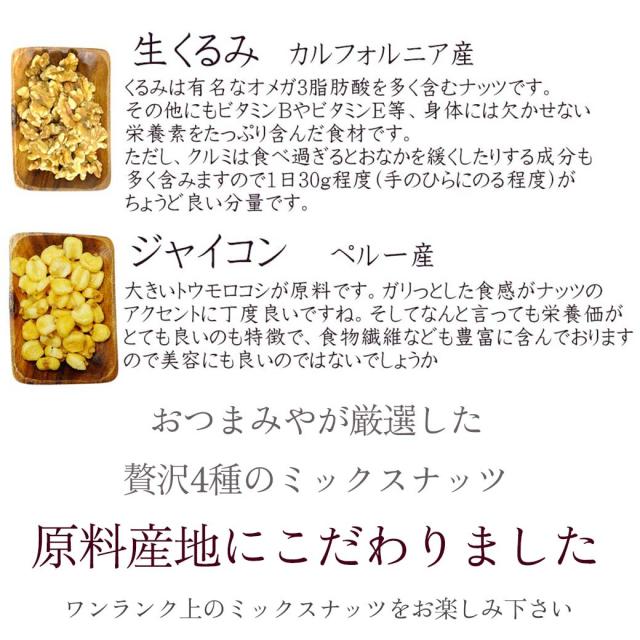 | おつまみ専門店が厳選した4種のミックスナッツ。 カシューナッツ アーモンド くるみ ジャイアントコーン の4種入り。 カリフォルニア産の大粒アーモンドや本場インド産カシューナッツ等 こだわりのナッツを贅沢に4種ミックスしました。 ウイスキー、ビールのつまみにぴったりのミックスナッツです。 |