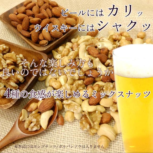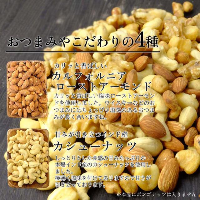贅沢4種類を混ぜ合わせたミックスナッツ。カリフォルニア産アーモンドやくるみ、本場インド産カシューナッツなどこだわりのナッツをブレンドしました。キリっと塩を効かせておりますので、「おつまみ・おやつ専用」のミックスナッツに仕上がっております。