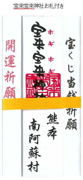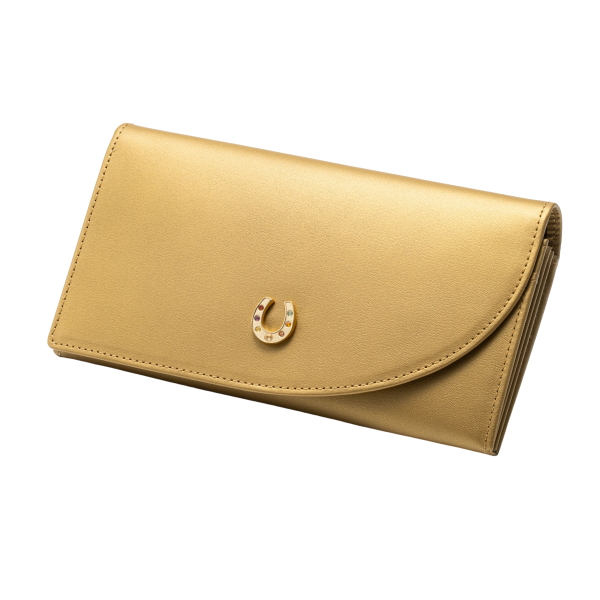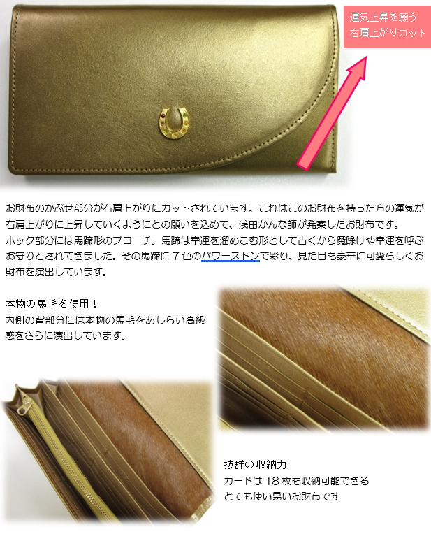 お財布のかぶせ部分が右肩上がりにカットされています。これはこのお財布を持った方の運気が右肩上がりに上昇していくようにとの願いを込めて、浅田かんな師が発案したお財布です。ホック部分には馬蹄形のブローチ。馬蹄は幸運を溜めこむ形として古くから魔除けや幸運を呼ぶお守りとされてきました。その馬蹄に7色のパワーストンで彩り、見た目も豪華に可愛らしくお財布を演出しています。さらに今回、宝くじ当選のご利益で有名な「宝来宝来神社」で丁寧にご祈祷した宝くじ当選開運祈願の「御札」を同封いたしますので、ぜひ財布の中に入れていただき、金運上昇のお守りとしてお持ちください。