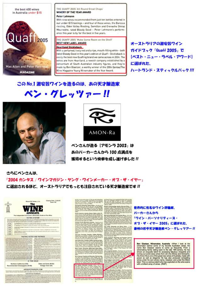 2005年12月26日のアドヴォケイトに掲載された「WINE PERSONALITIES OF THE YEAR 2005」!!。ここにはパーカーさんが今もっとも気になるワイン醸造家やディストリビューター、インポーターの名前が載せられています。その中に豪州の超カルトワイン【アモンラ】を生み出した、ベン・グレッツァーの名も刻まれています!!