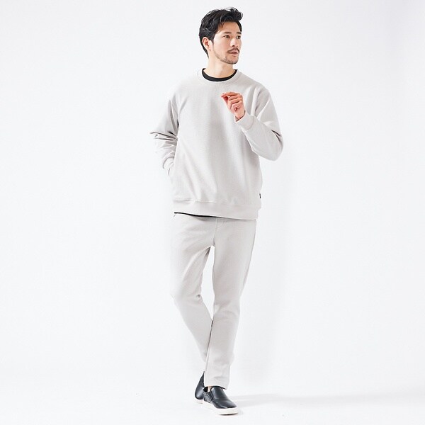 ラフな印象のスウェットを、上品な光沢のある素材や裾口の控えめなブラックピスネーム仕様できれい目な印象に仕立て、大人のクールでエレガントな雰囲気を演出してくれます。