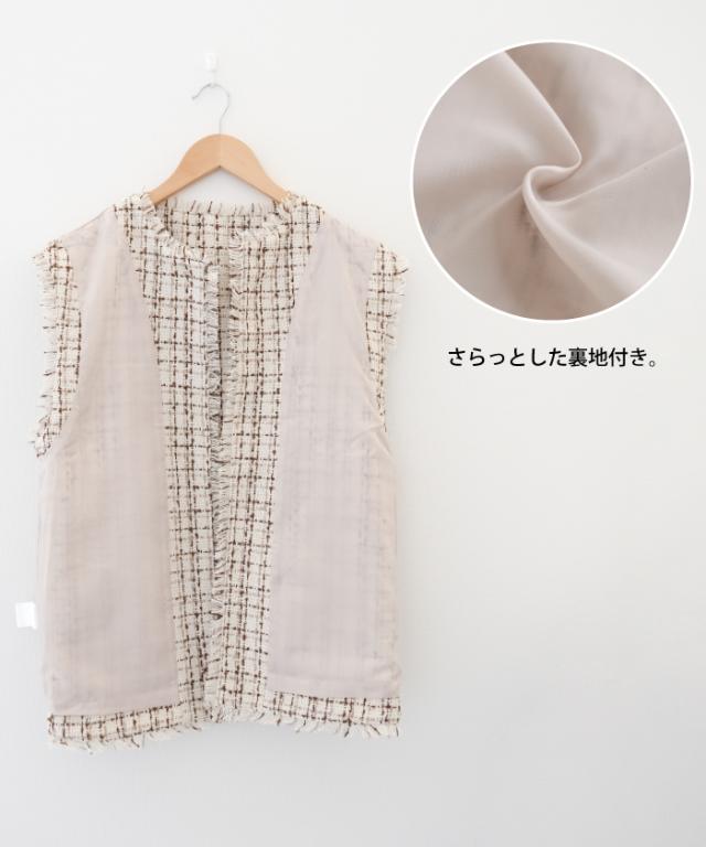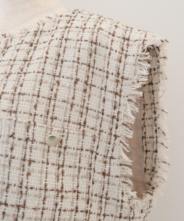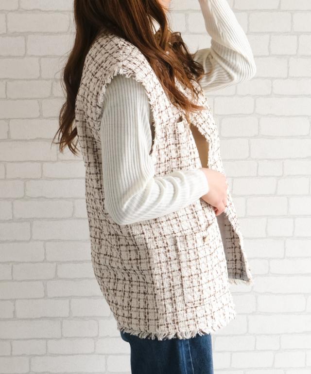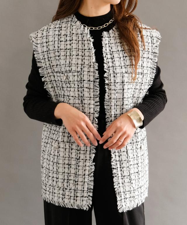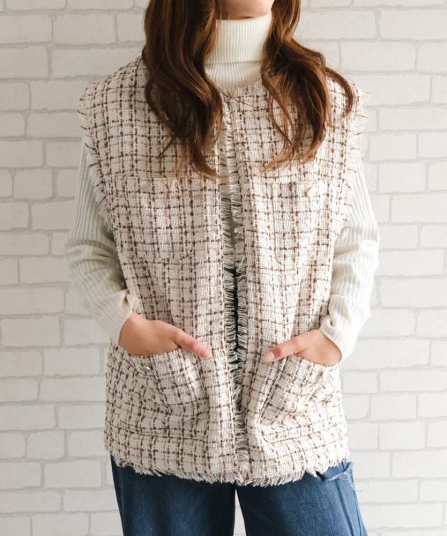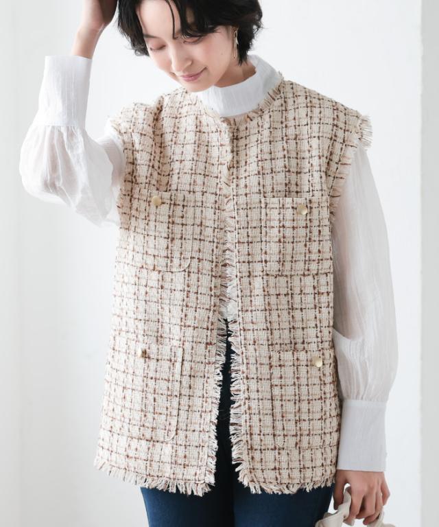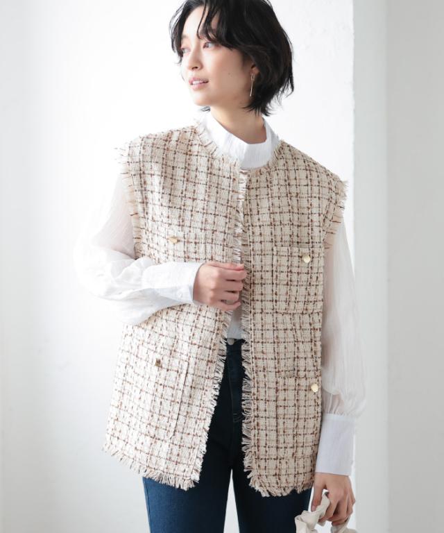高見えするツイード素材がこなれた印象のフリンジベスト。