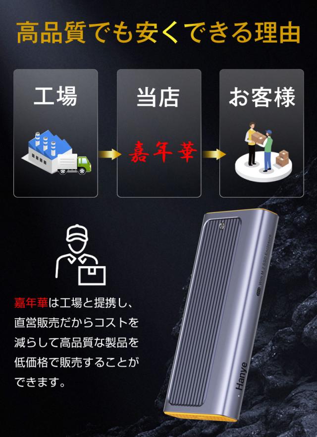 Hanye M.2 SSD用外付けケースは厳格な品質管理基準に基づいて作られ、同時にユーザーに1年保証のアフターサービスを提供します。